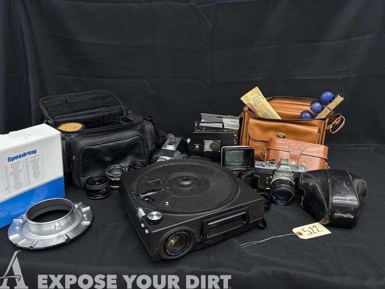 2 Speedrings, Focal Lenses, Yashica SU-60 E, Cine-Kodak Eight Model 20, Nipole 35mm Slide Viewer, Minolta Camera with case, Ansco Flash Shield, Sylvania Blue Dots for Sure Shots, Kodak Carousel Auto-Focus 760H with case