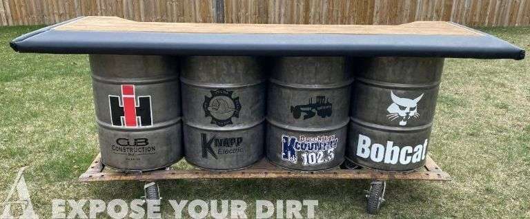 Stand or sit around this unique bar in your shop or garage! With unique craftsmanship, this solid bar is made from barrels, grader blades, wood, casters, and wired for accent lights and an outlet. Stored inside.