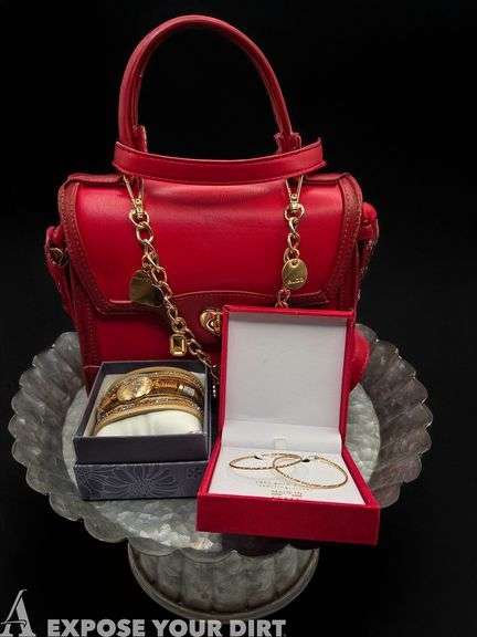 Tin cake stand with Aldo purse, bracelets, and gold hoop earrings. Donated by the Coull Family.