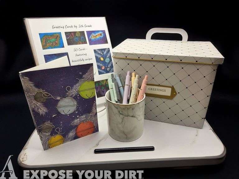A stationary set that includes 50 greeting cards featuring beautiful and unique artwork by the STMCS 5th grade class, a lap desk, card box, and pens. The card set includes Christmas designs. Handcrafted by Mrs. Ortiz’s 5th grade class.