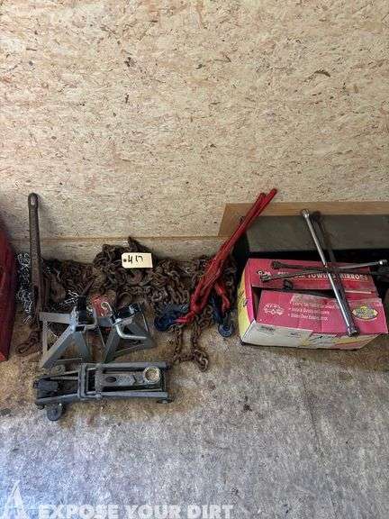 Chains, binders, and jacks with some tire irons and tow mirrors.